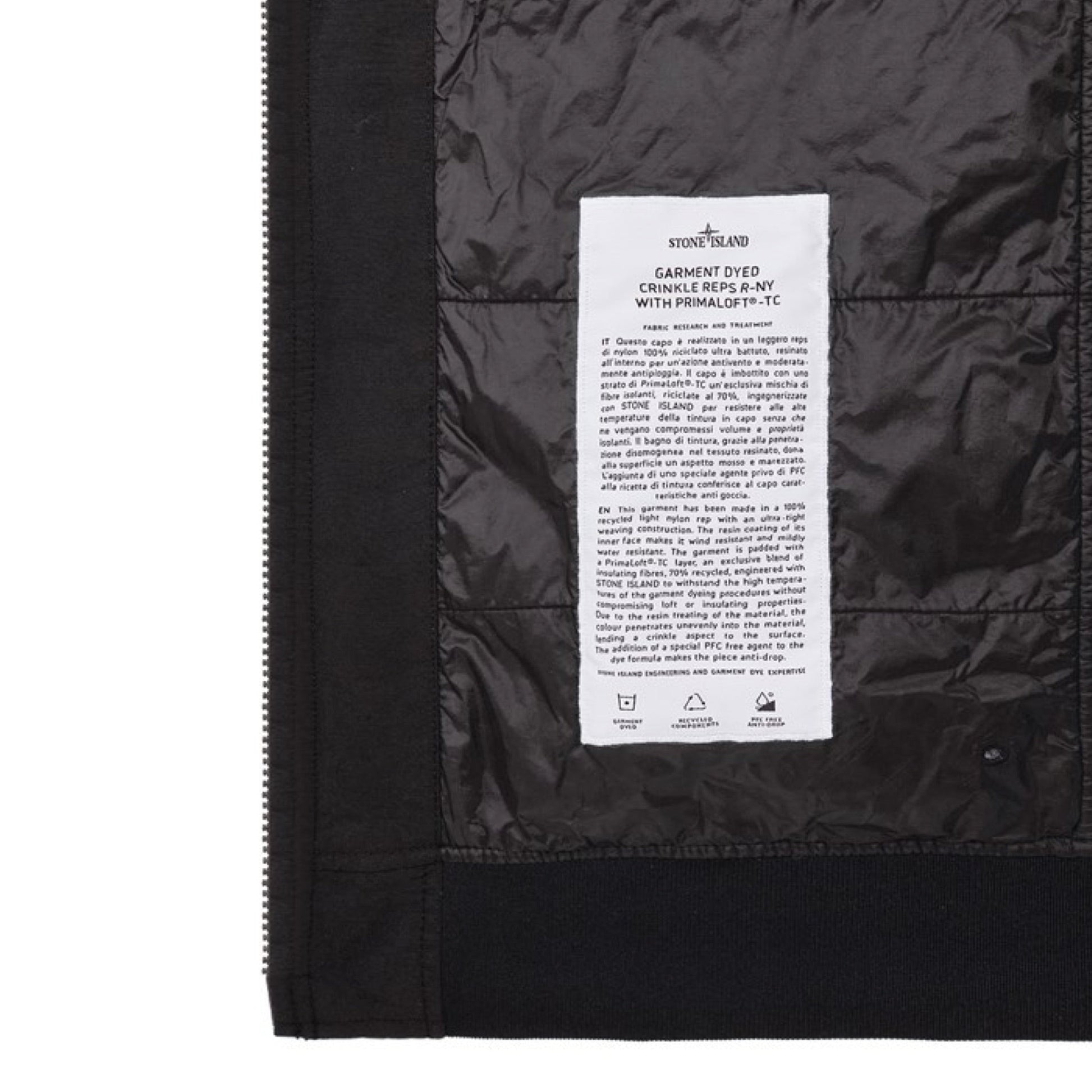 Experience the perfect blend of style, functionality, and sustainability with our Garment Dyed Crinkle Reps Recycled Nylon Bomber Jacket. Crafted from 100% recycled light nylon rep with an ultra-tight weaving construction, this jacket offers superior wind resistance and mild water resistance, thanks to its resin-coated inner face. Padded with PrimaLoft®-TC, an innovative insulation layer made from 70% recycled fibers developed with Stone Island, it withstands high garment dyeing temperatures without losing its loft or insulating properties. The resin treatment gives it a unique crinkle texture and uneven color penetration, while a special PFC-free agent in the dye formula makes it anti-drop. Style features include a ribbed collar, hidden chest zip pocket edged with herringbone nylon tape, hand pockets with triangular flaps and snap fastenings, the iconic Stone Island badge on the left sleeve, ribbed cuffs and bottom band, and a two-way zip fastening. Elevate your outerwear collection with this eco-friendly, high-performance bomber jacket that combines advanced material technology with contemporary design.