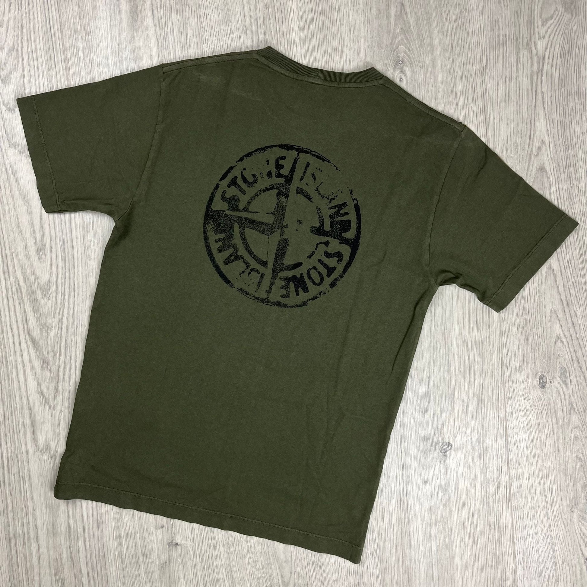 Olive Green Stone Island 'Stamp Two' T-Shirt with centrally printed branding and large compass print on the back